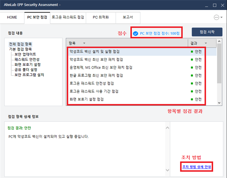 - PC 보안점검 점수 및 항목별 점검 결과 확인