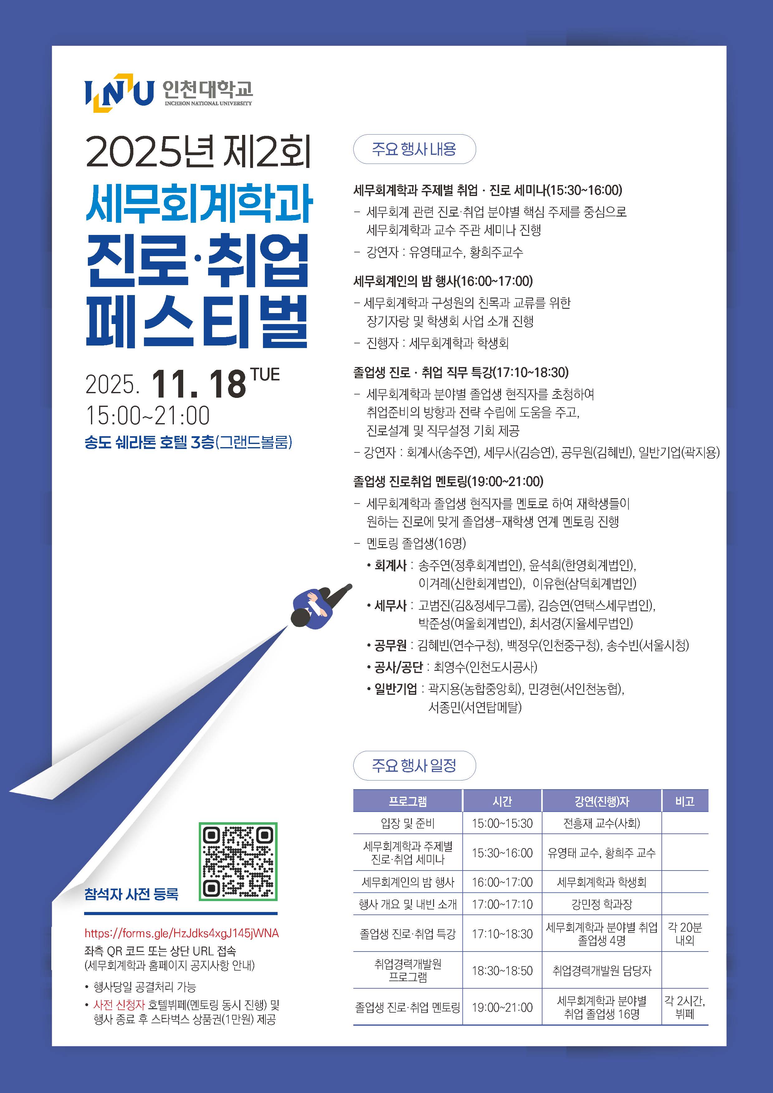 fnctId=bbs,fnctNo=384 2025년 제2회 세무회계학과 진로․취업 페스티벌 사전 신청 안내 글번호 414995 작성일 2025-11-12 수정일 2025-11-12 작성자 세무회계학과 (032-835-8720) 조회수 11 사전신청(링크) : https://forms.gle/miH81SrBWAcChDy67 첨부파일 첨부파일이(가) 없습니다. 다음글 이전글 세무회계학과 2025-2학기 졸업시험 안내 및 범위 전동진 2025-11-07 11:14:24.0 목록